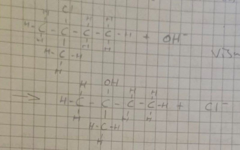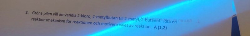 Hej, jag gjorde en uppgift där jag skulle rita reaktionsmekanismen då 2-kloro-2-metylbutan omvandlas till 2-metyl-2-butanol. Kommer inte längre än så här. Hur ska man rita elektronövergångar? Hur går det till?