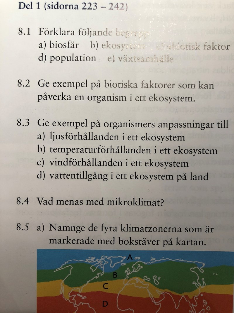 A-D i uppgiften är fyra olika abiotiska faktorer, vilka var och en påverkar en organisms möjligheter att överleva och fortplanta sig. För att öka chanserna för organismens/artens överlevnad, kan den anpassa sig. Hur kan denna anpassning ske?