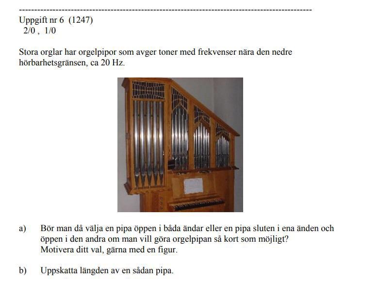 på a) så tänker jag att en pipa som är öppen är ju ½ våglängd och för sluten pipa gäller 1/4våglängd, man bör då välja en sluten orgelpipa om man vill ha så kort längd som möjligt,