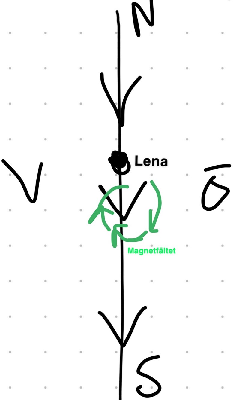 "Eftersom Lenas kompass är ovanför ledaren så är ledarens magnetfält där riktat xxx" (här skriver du ett väderstreck, alltså norrut, söderut, västerut eller österut).