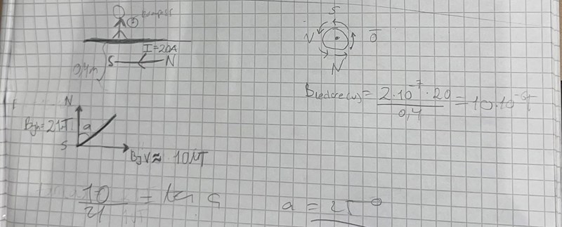 Under en orientering sätter sig Lena ner för att ta ut en ny kompassriktning. Utan att hon vet det håller hon kompassen 0.4 m över en markledning som går i nord sydlig riktning. Ledningen förmedlar 20A likström från en solcellsanläggning. Beräkna hur många grader fel kompassen visar. Det jordmagnetisms fältets horisontalkomposant är 21mikroT på platsen.