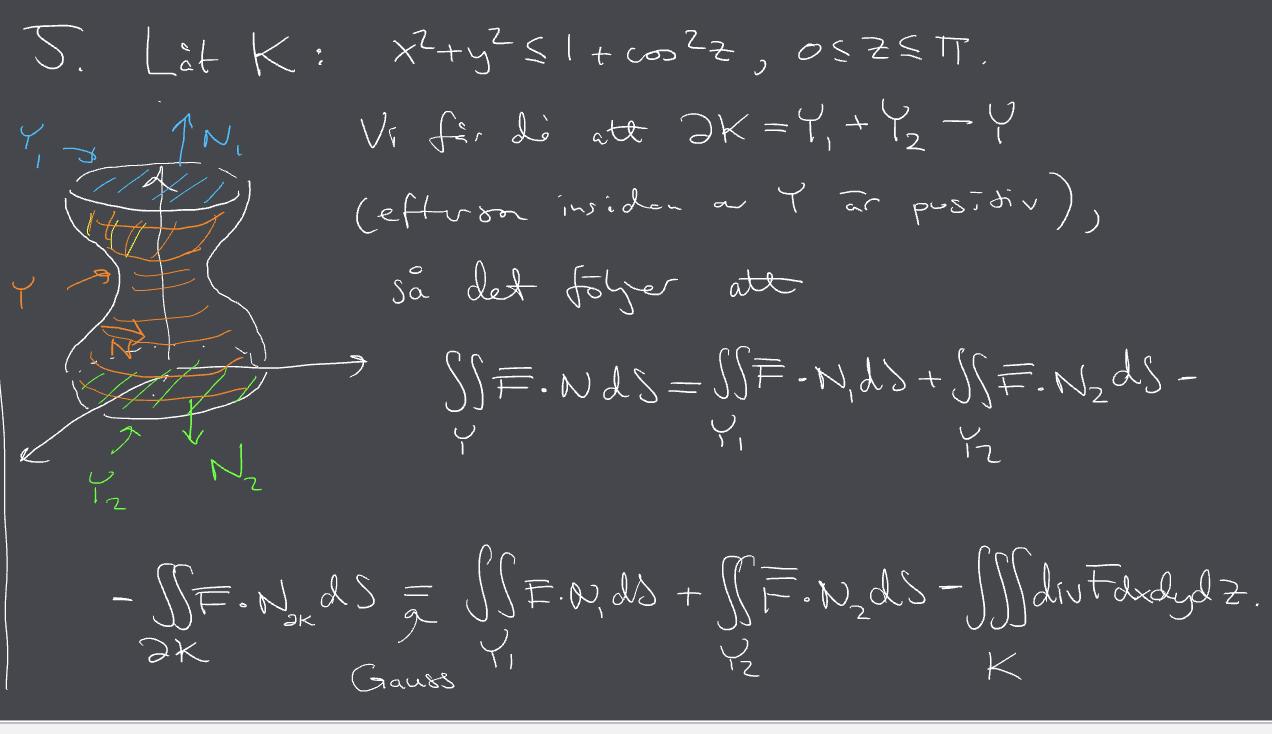 Tack. Vi ger ett minustecken på ytan Y för att normalen pekar inåt. Men ytorna Y1 och Y2 är ju inte med i K som vi vill beräkna från början. Ökar vi inte flödet när vi adderar flödesintegralerna?