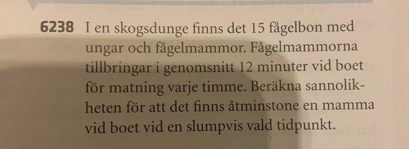 EmmaJo skrev:Testa att räkna med komplementhändelse. Räkna ut sannolikheten för att det inte finns någon fågelmamma vid något bo alls vid en viss tidpunkt. Detta är nämligen komplementhändelsen till att det finns åtminstone en mamma vid en viss tidpunkt. Klicka inte förrän du försökt räkna ut det ;)