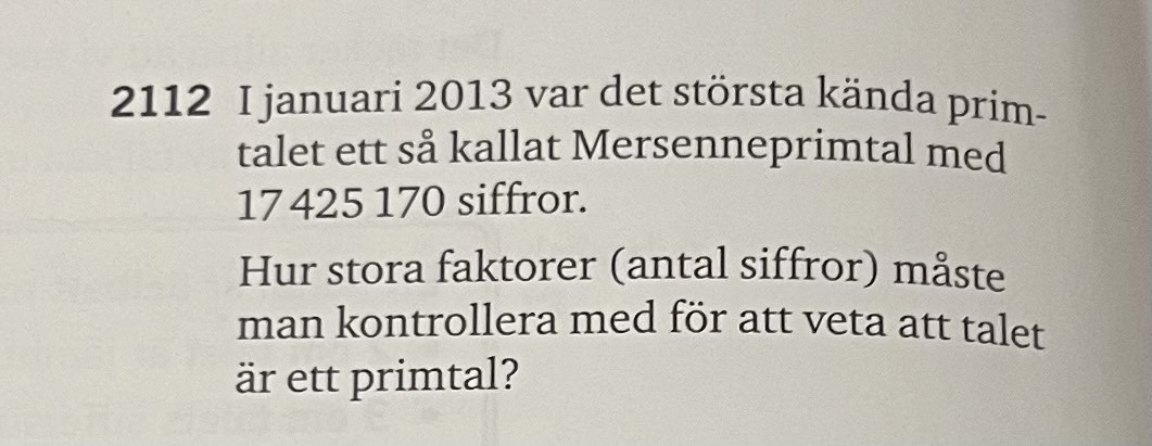 Kurdistan011 skrev:Laguna skrev:Har du fått uppgiften tidigare att kontrollera om t.ex. 191 är ett primtal, eller något annat hanterbart tal?