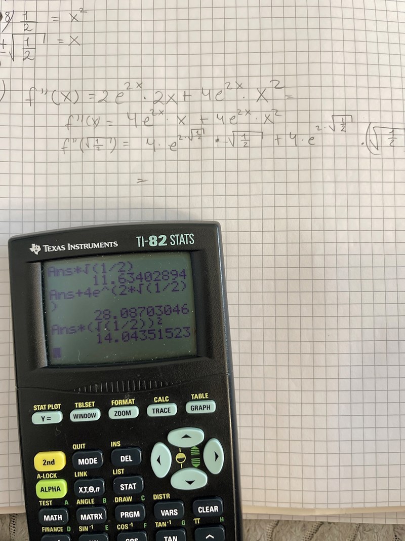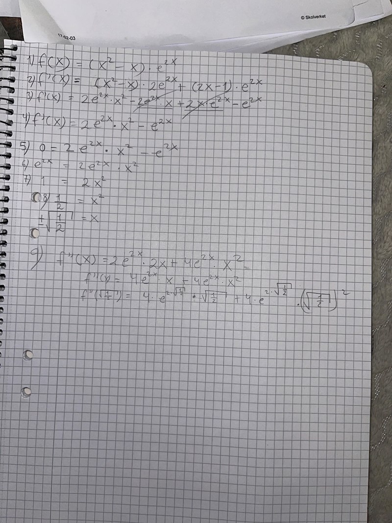 Ska jag sedan använda andra derivatan? För jag fick att funktionen f’(x)=0 då x=+-sqrt(1/2)