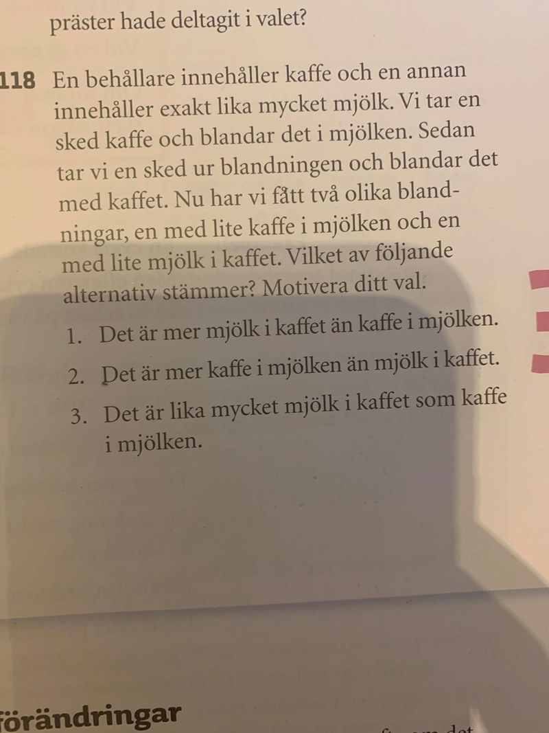 Testa att sätta lite siffror på det. Tänk till exempel att du först flyttar 10g kaffe till möjlken, och sen flyttar tillbaka 8g mjölk och 2g kaffe. Hur mycket kaffe ligger i mjölken och hur mycket mjölk ligger i kaffet? Ändras svaret när vi ändrar siffrorna?