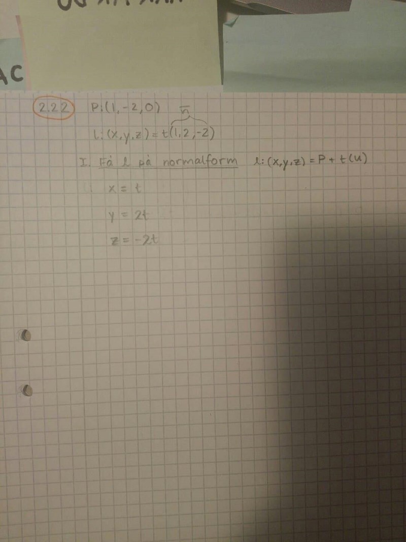 Jag är rätt säker på att jag kan klara av att räkna ut själva projektionen, men det är det första steget att skriva om linjen till normalform (det kanske egentligen inte behövs? Men det är utifrån normalformen jag lärt mig att hitta projektioner.) I föregående uppgifter och i lärobokens exempel när man ska skriva om från parameterform till normalform, finns det alltid också termer utan parametrarna s och t. Då brukar man bara lösa ut s och t och sätta in dem i nån utav ekvationerna och på så sätt få en linje på formen a(x-a0)+b(y-b0)+c(z-c0)=0, och därifrån kan jag hitta den ortogonala ekvationen. Jag förstår inte riktigt hur jag ska finna normalekvationen när jag bara har termer med t.