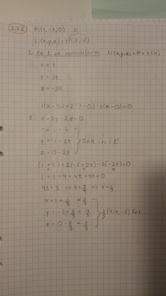 "Bestäm den ortogonala projektionen av punkten P:(1,-2,0) på linjen l:(x,y,z,)=t(1,2,-2)." (Linjär algebra, Kapitel 2: Vektorer som geometriska objekt)