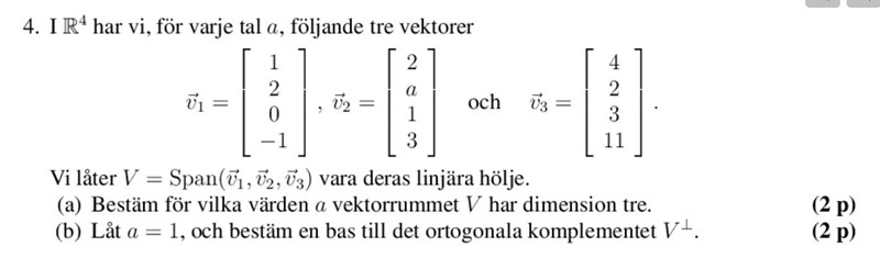 b) Du kan ta en vektor v4 = (b,c,d,e). Den ska vara ortogonal mot v1, v2 och v3. 3 ekvationer, 4 obekanta (längden är fri).