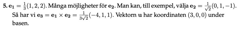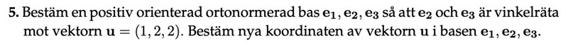 Här är uppgiften och även med lösningsförslag. Förstår var ortonormerad bas är och att e1 väljs som den gör. Undrar hur man väljer e2? Kan man välja vilka tal som helst eller vad är det som måste uppfyllas?