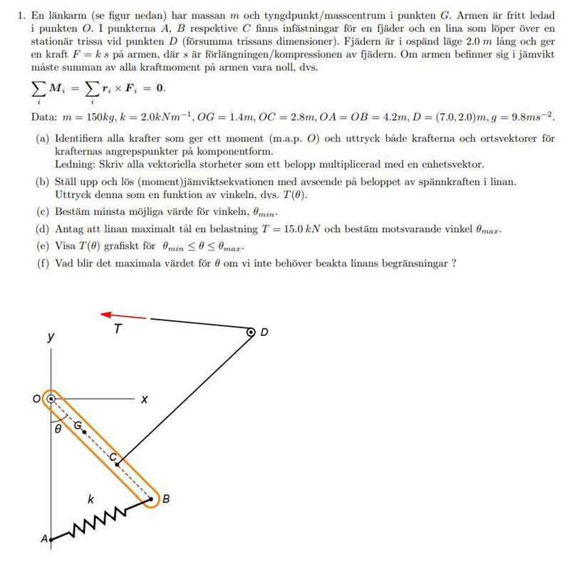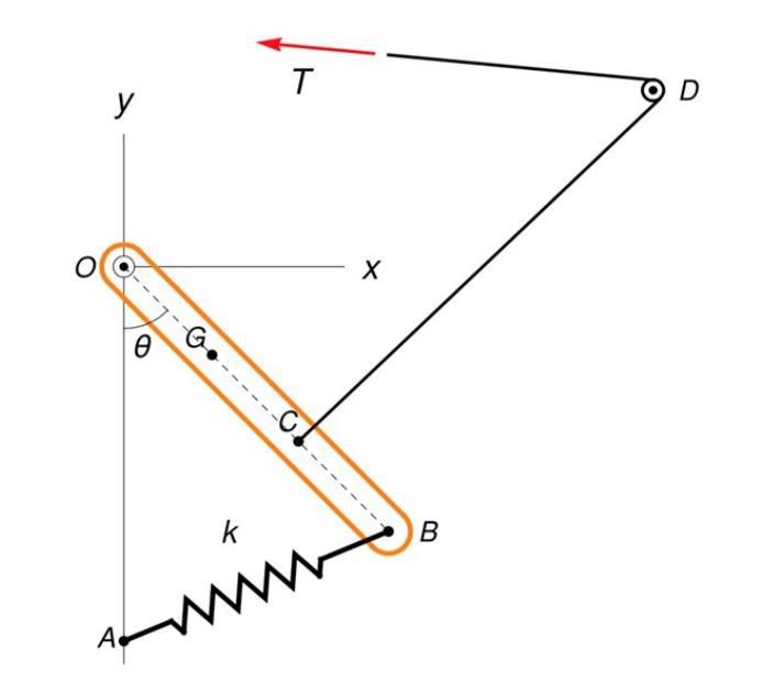 En länkarm (se figur nedan) har massan m och tyngdpunkt/masscentrum i punkten G. Armen är fritt ledad i punkten O. I punkterna A, B respektive C finns infästningar för en fjäder och en lina som löper över en stationär trissa vid punkten D (försumma trissans dimensioner). Fjädern är ospänd när vinkeln θ = 0 och ger sedan en kraft F = k s, där s är förlängningen av fjädern. Om armen befinner sig i jämvikt måste summan av alla kraftmoment på armen vara noll, dvs.