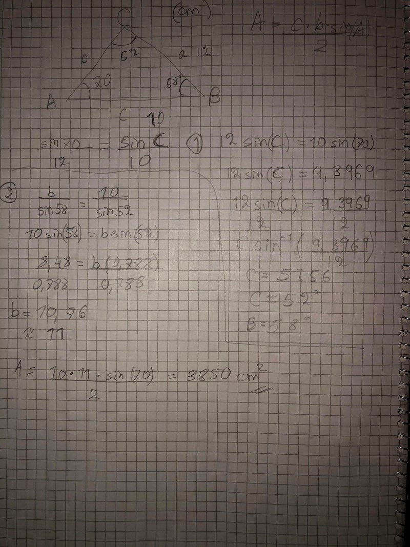 När du har räknat ut C, och jag ser att du passar på att räkna ut B också, så kan du använda areasatsen (med 10, 12 och B) så behöver du inte räkna ut b.