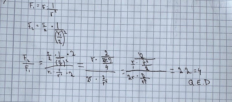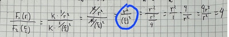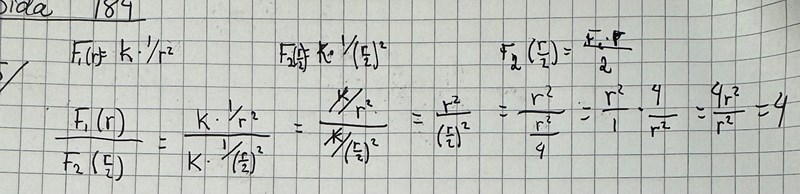 Det betyder att F(r2)=k·1(r2)2F(\frac{r}{2})=k\cdot\frac{1}{(\frac{r}{2})^2}