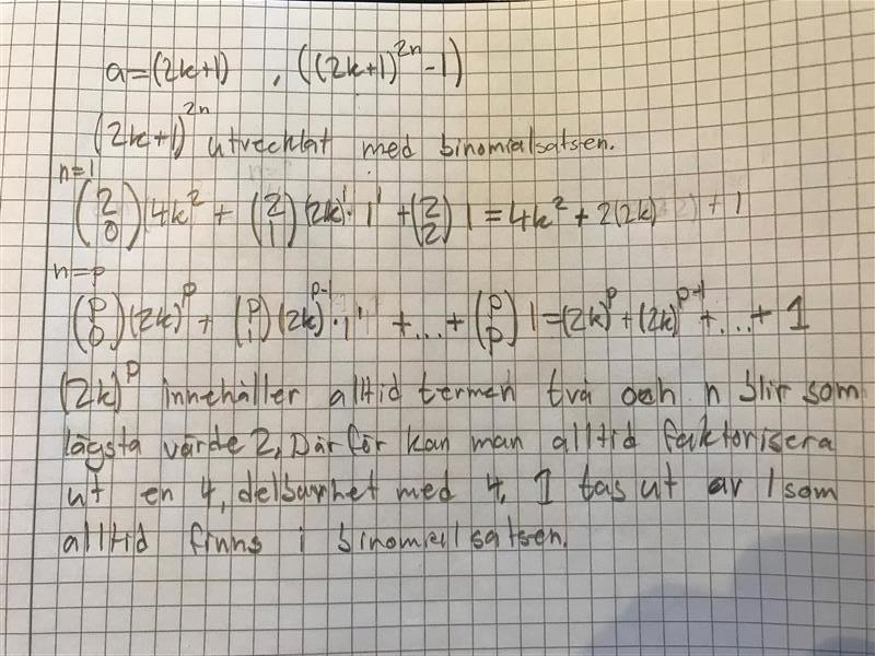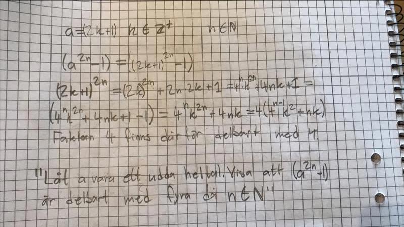 "Låt a vara ett udda heltal. Visa att (a2n - 1) är delbart med fyra då n tillhör N"