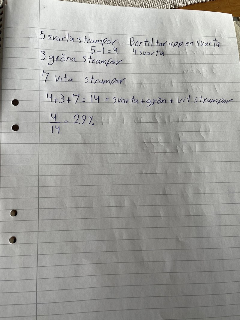 I en byrålåda finns det fem svarta, tre gröna och sju vita strumpor. Bertil tar upp en svart strumpa ur lådan. Hur stor är sannolikheten att han på måfå lyckas ta upp ytterligare en svart strumpa ur lådan?