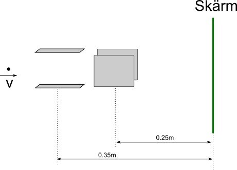 När den sen kommer in mellan de två första plattorna påverkas den av en kraft riktad mot den ena plattan, så länge elektronen är mellan plattorna kan man hantera det som en kaströrelse. Tyngdkraften kan man bortse från.