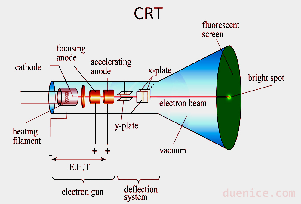 En "Cathode Ray Tube" skickar elektroner mot en flourocerande skärm. Där elektronstrålen träffar lyser en prick upp på skärmen.