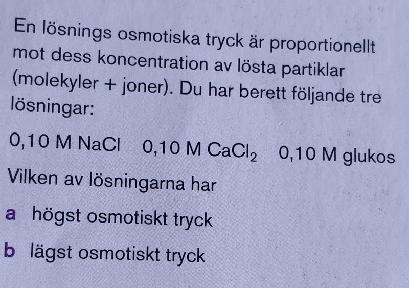 Om jag har förstått det rätt så har en vätska med hög halt av lösta partiklar högt osmotiskt tryck. Alla tre ämnen har samma koncentration (0,1 mol/l) men NaCl har 2 joner, CaCl2 har 3 och glukos har 24 (är osäker på att det är 24). Borde det inte innebära att glukos har högst tryck medans NaCl har lägst?