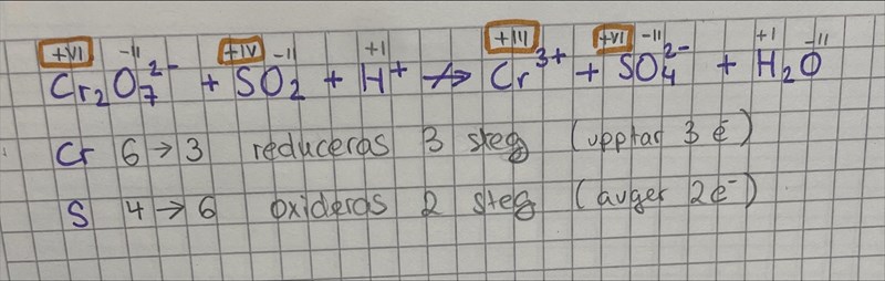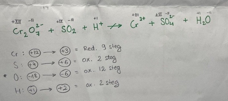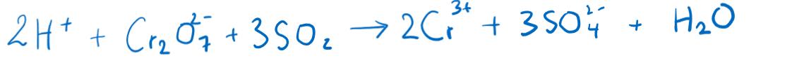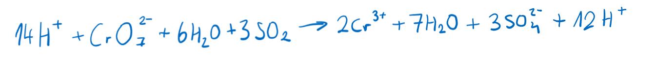 Sorry, jag hänger inte med i det du skriver. Vi har alltså en dikromatjon (2 krom med ox.tal +6) och 3 svaveldioxid (där svavel har ox.tal +4) som bildar 2 Cr3+ och 3 sulfatjoner. Då har vi totalt 7+3.2 = 13 syreatomer på vänstersidan och 3.4 = 12 syreatomer på högersidan. Då behäver det bildas 1 vattenmolekyl, och till den går det åt 2 stycken H+. Reaktionsformeln blir alltså CrO72-+3 SO2 + 2 H+ => 2 Cr3+ + 3 SO42- + H2O. Om vi har gjort rätt så skall laddningarna stämma också: vänstersidan -2+2 = 0 och högersidan 2.3-3.2 = 0. Hurra!