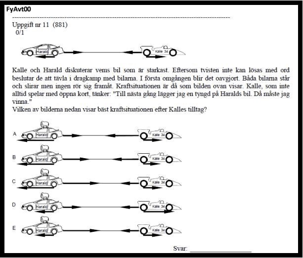 Att välja A är även lite problematiskt i det att resultanterna på de individuella bilarna ser ut att vara lika stora, men om så är fallet så har de ju olika accellerationer iochmed att de har väldigt olika massor. Vilket bryter premissen att sammanlänkade kroppar har samma accellerationer.