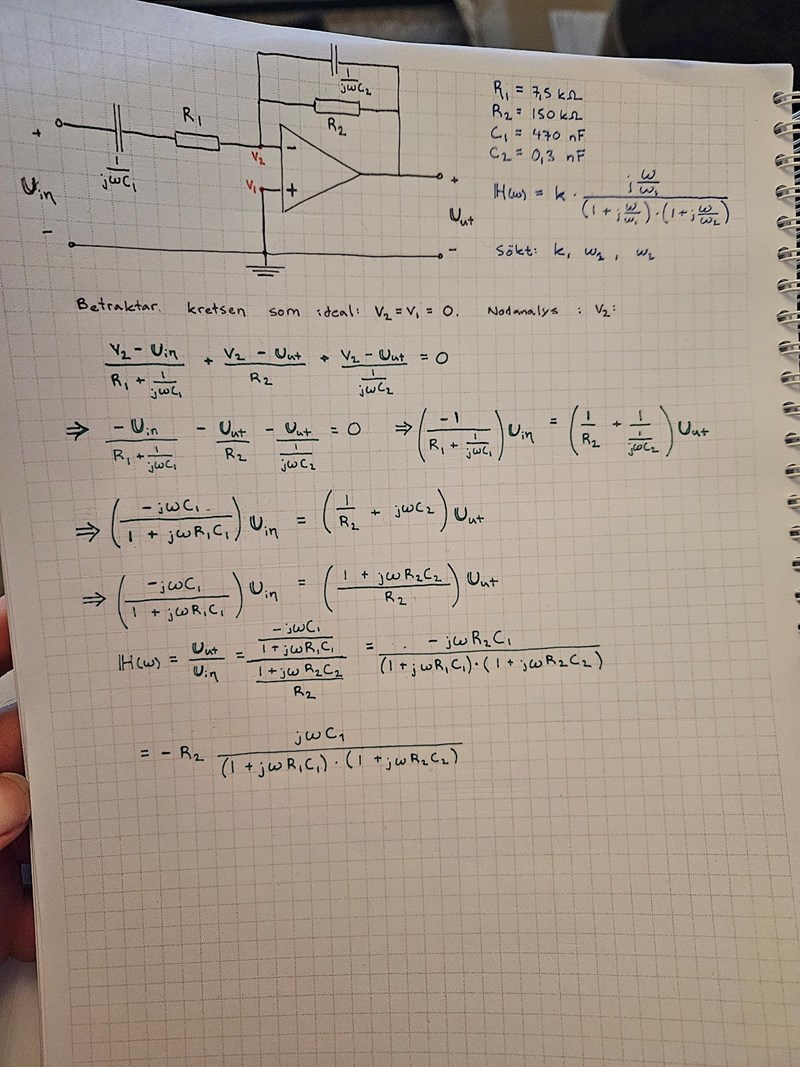 Tjena! Uppgiften vill att jag tar fram K, w1 och w2. Jag får rätt på w1 och w2 men ser att det blir fel i nämnaren på något sätt. Konstanten K kan inte bli -R2... Saknar R1 i täljaren om det ska följa formeln för överföringsfunktionen men har gjort omräkningar för att se så allt är rätt och jag kan inte hitta felet.