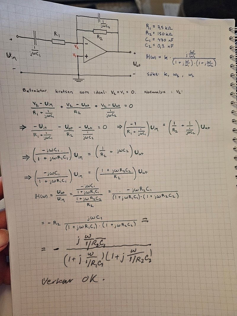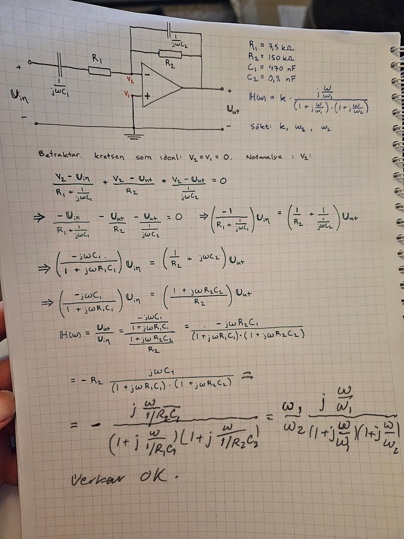 Ja jag ser det som att beräkningarna stämmer, men täljaren som den står skriven för mig nu (om man ignorerar sista steget) är -jwR2C1 vilket inte ger mig enligt formeln . Och bryter jag ut något för att få ett k-värde så blir det inte bättre för det.
