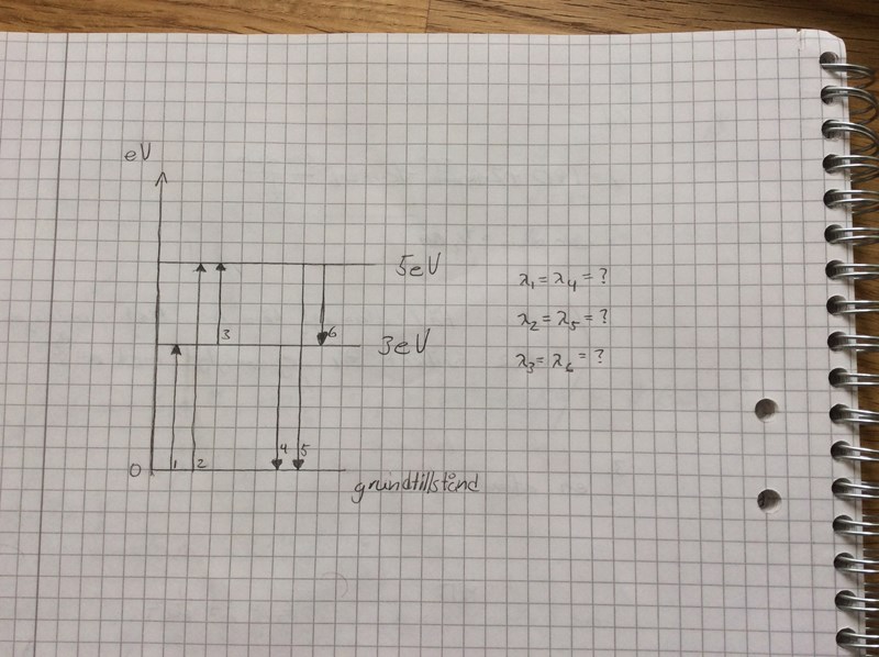 Totalt söks fem övergångar.  Ange i samtliga fall vilken energi (i eV) samt våglängd (i nm) övergången motsvarar.”