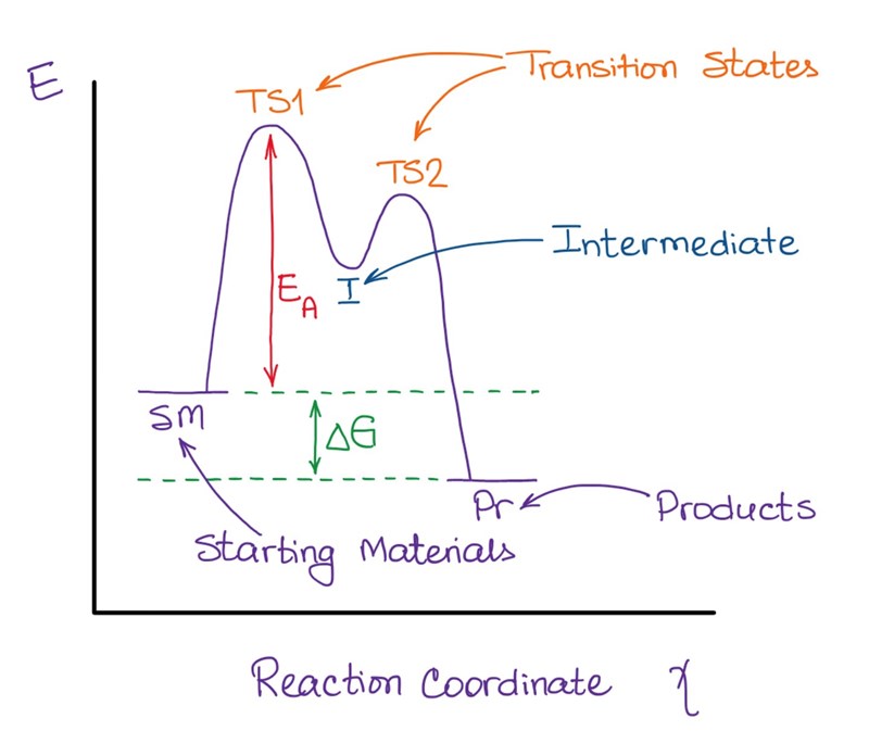 Intermediärer är en form av t.ex. ett ämne som bildas under omvandlingen av från ett annat ämne A till produkten C, d.v.s. intermediären motsvarar B, som uppstår under reaktionen från A och C. Och under övergången mellan A och B, finns ett TS1, och när det passeras bildas B.