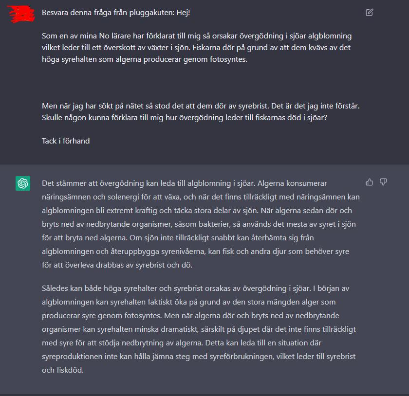 Men när jag har sökt på nätet så stod det att dem dör av syrebrist. Det är det jag inte förstår. Skulle någon kunna förklara till mig hur övergödning leder till fiskarnas död i sjöar?