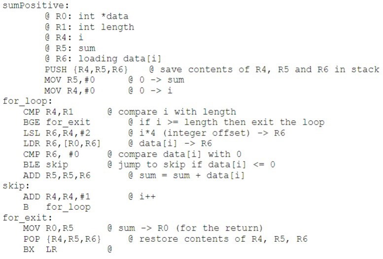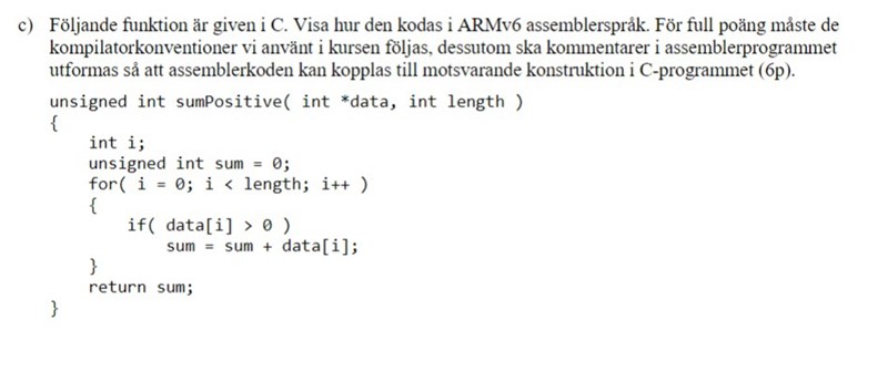 Det jag fastna på: Varför laddar man data[i] till R6 när vi redan har ett register för *data som vi kan använda? Är det inte onödigt att ladda data[i] till R6? Notera att i Arm v6 processorn försöker man bara använda register R0-R3.