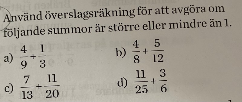 Egentligen vet jag inte om jag vill kalla det överslagsräkning i den här uppgiften. I varje deluppgift avgör vi säkert om summan är större eller mindre än 1.
