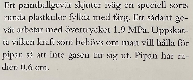 För att lufttrycket på utsidan hjälper dig med kraften 101,3 kPa.(pipans tvärsnittsarea). Om du och paintbollgeväret hade varit i vakuum skulle din beräkning ha varit korrekt.