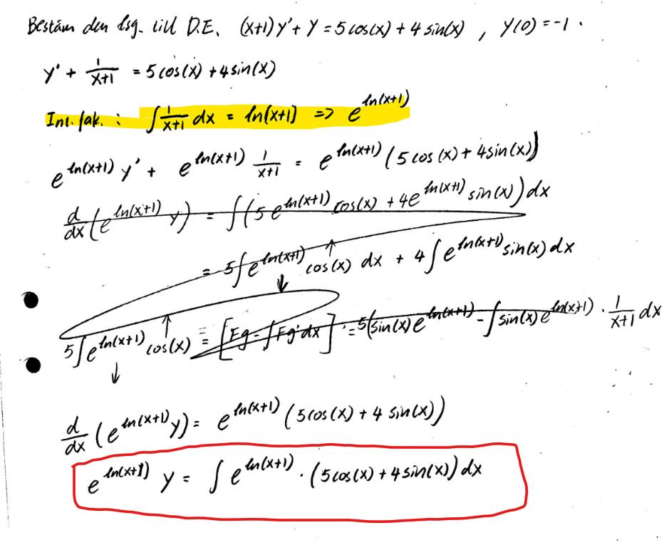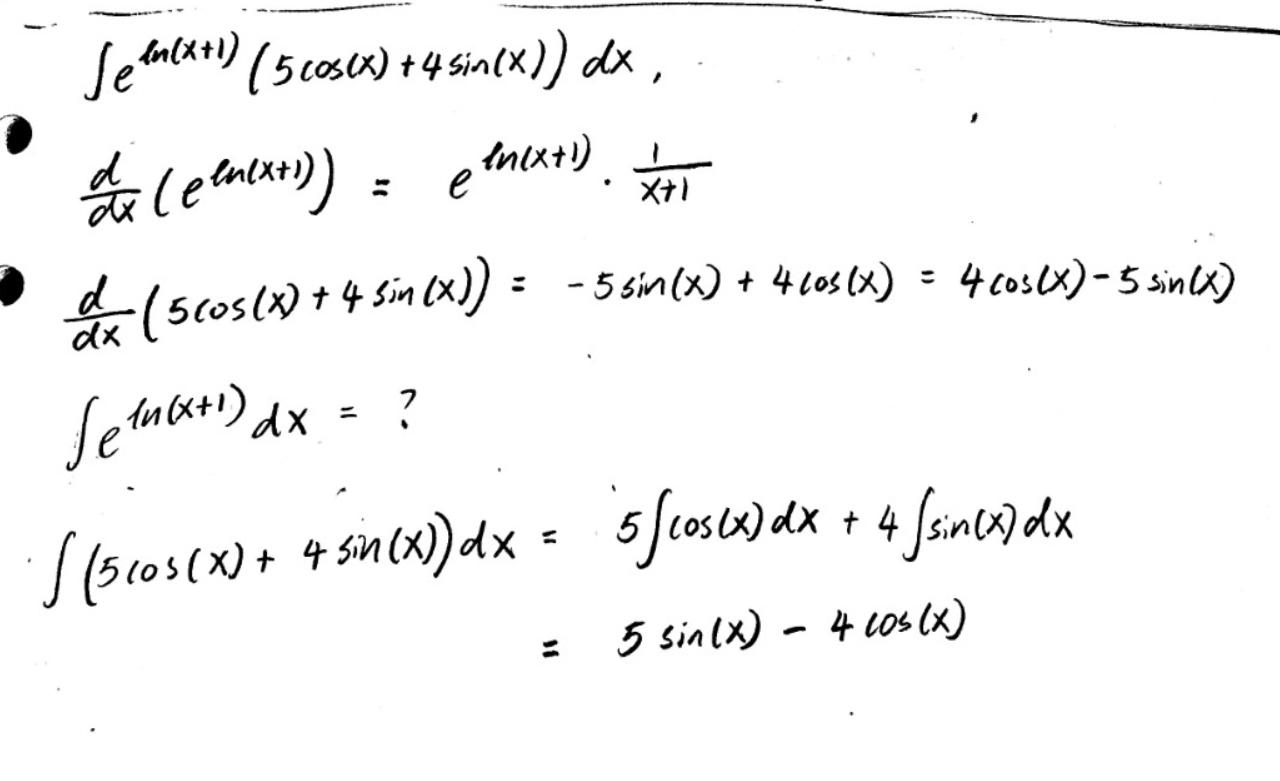 uttrycket 5cos(x)+4sin(x) känns om den enklare att deriverar. Men jag kan inte räknar ut integral av e^ln(x+1). Vad ska ja göra nu?