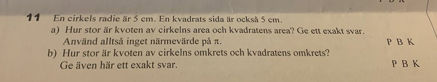 Beräkna kvoten mellan cirkelns area och kvadratens area.Det är uppgift 11a)