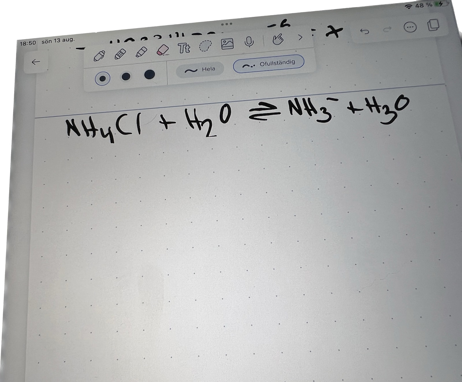Stämmer. Hur många mol NH4+ får vi per mol NH4Cl? Hur många mol H3O+ får vi per mol NH4+?