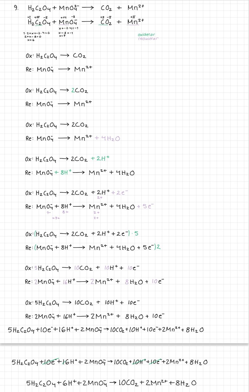 Det finns 2 kolatomer i oxalsyran och 1 mangan i permanganatjonerna. Kol går från +3 till +2 så 1 steg? Mangan från från +7 till +2 så 5 steg?