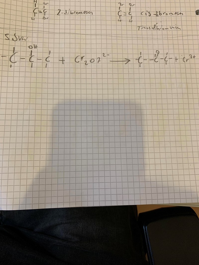 Jag förstår att varje krom reduceras tre steg från oxidationstal 6 till oxidations tal 3, och kolatomen oxideras 2 steg. Måste det då inte bli 3 2-propanol och 2 dikromat och krom? Eller blir det 4 krom joner i produkterna då?