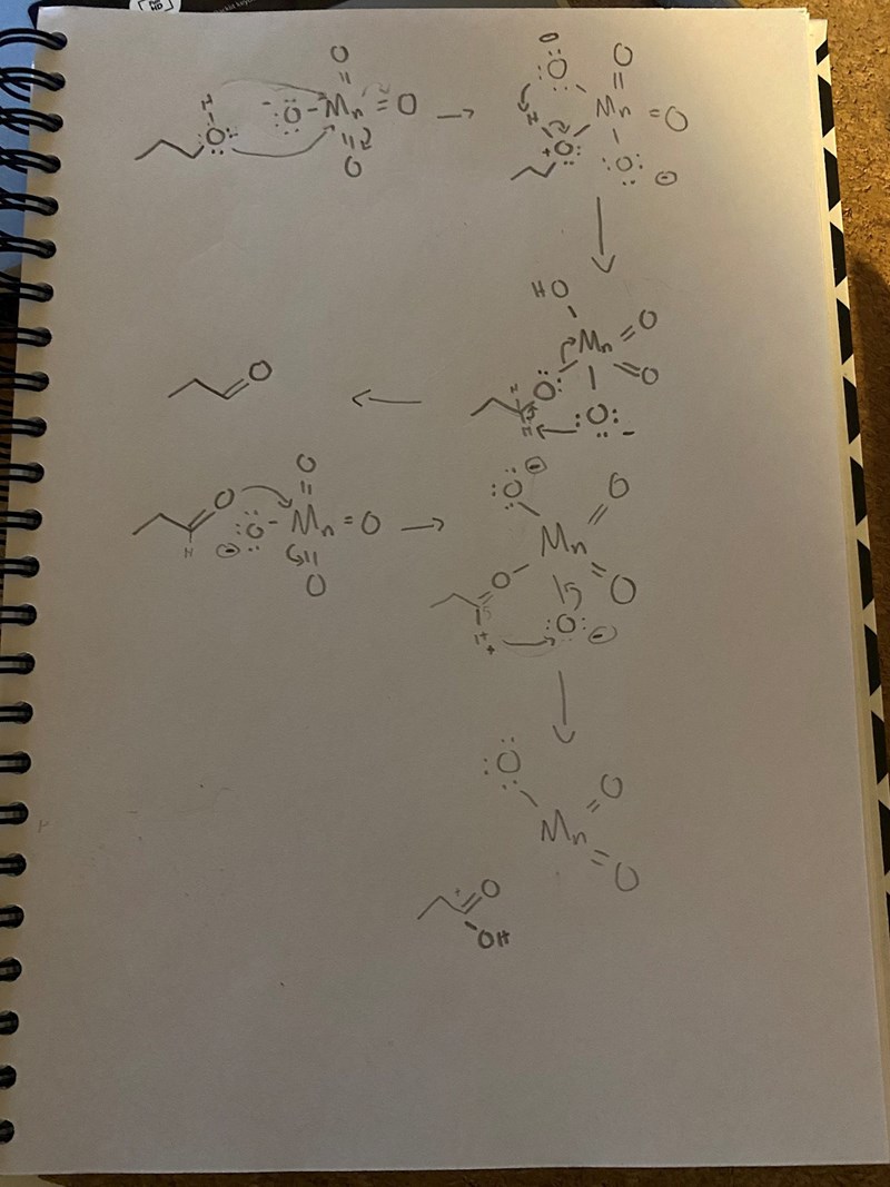 Jag försöker ta reda på exakt hur etanol oxiderar till etansyra med hjälp av KMnO4. Jag har fått hjälp med hur en sekundär alkohol oxideras till en keton, och då sas det att proceduren bara skulle upprepas vid en primär alkohol. Jag har försökt rita hur det skulle gå till men det känns väldigt fel. Jag vet inte hur jag ska göra eller vad som händer.