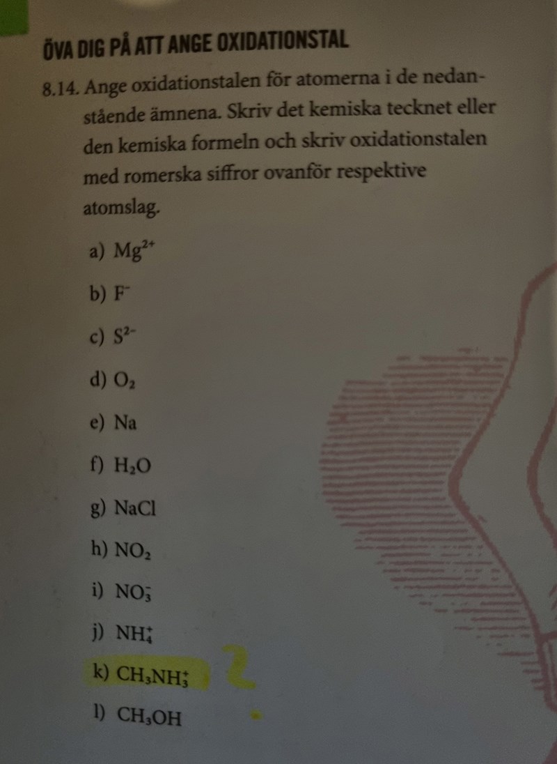 Hej, är det någon som kan förklara för mig hur man ska tänka i k-uppgiften nedan? Jag vet ju att väte har oxidationstalet +I, och att hela den sammansatta jonen ska få laddningen +I. Men jag vet ju inte vad jag ska sätta ut för oxidationstal på C eller N.