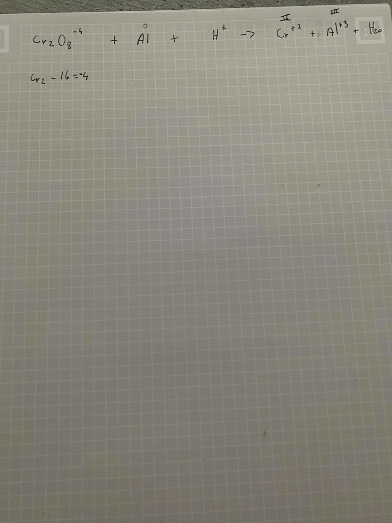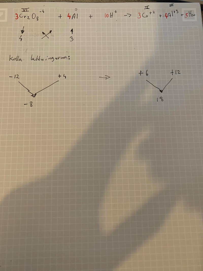det jag gör är: krom går ner 4 steg och Alu går upp 3 steg? Jag gör sedan ”kors metoden” och lägger koefficienterna framför, om det bildas så mycket på vänster sida så måste det bildas lika mycket på höger sida.