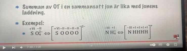 Helhetsladdningen på jonen är -2 (det får vi reda på genom att kolla på den upphöjda tvåan). Alltså måste svavel vara positiv! Vi har sedan tidigare "beräkning" konstaterat att syret har en "helhetsladdning" på -8. alltså