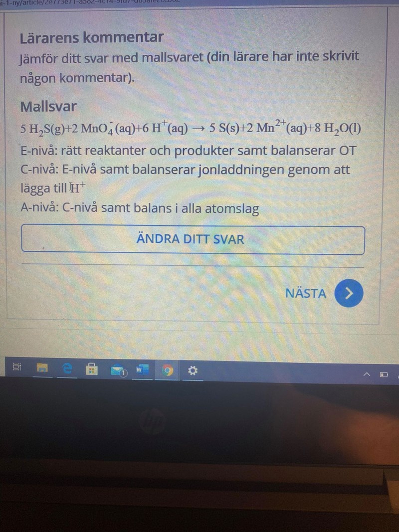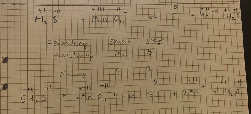 men enligt facit ska det vara 6 vätejoner på reaktanternas sida och 8 vattenmolekyler på produkternas sida, hur blir det sådär?
