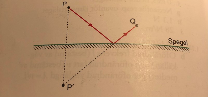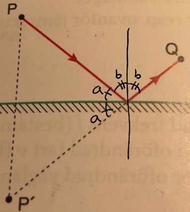 Strålgången från P till Q är indikerad med rött i bilden. Det som ska gälla är att att reflektionsvinkeln b ska vara lika stor som infallsvinkeln.