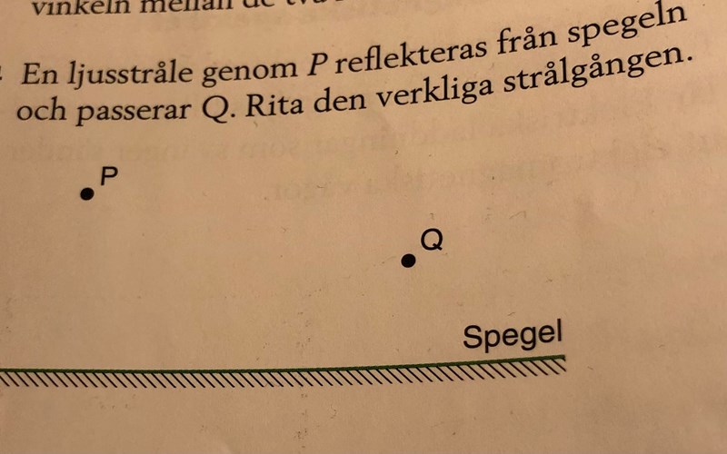 Jag har lite svårt att veta vart man börjar titta dvs vart man ska börja titta på strålningarna. Men om jag börjar att titta på P så kmr den med sin infallande vinkel in mot normalen för att sedan skickas ut på andra sidan spegeln så att en triangel bildas. Men allt därefter förstår jag inte.