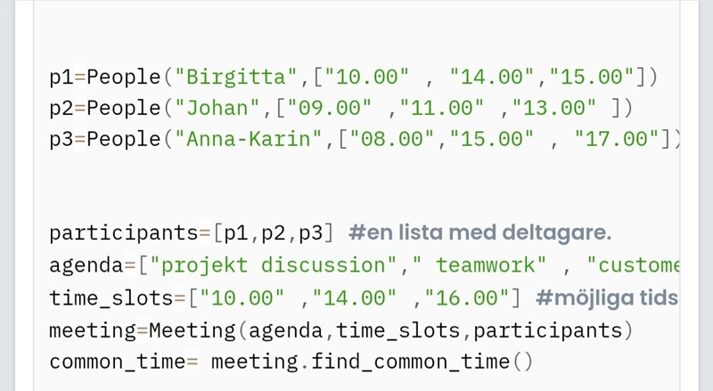 def find_common_time(self): #definierar metoden find_common_time som söker efter en tidpunkt som alla deltagare är tillgängliga.