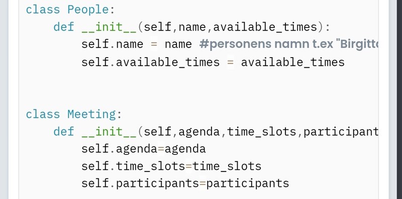 class People: def __init__(self, name, times,dates): self.name = name self.available_times = times self.available_dates = dates class Meeting: def __init__(self, schedules, time_slots, participants, available_dates): self.schedules = schedules self.time_slots = time_slots self.participants = participants self.available_dates = available_dates