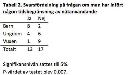 Man undersöka huruvida det finns en skillnad mellan åldersgrupperna när det gäller införandet av tidsbegränsning av nätanvändande. Nollhypotesen: det finns ingen skillnad mellan åldersgrupperna när det gäller införandet av tidsbegränsning av nätanvändande.