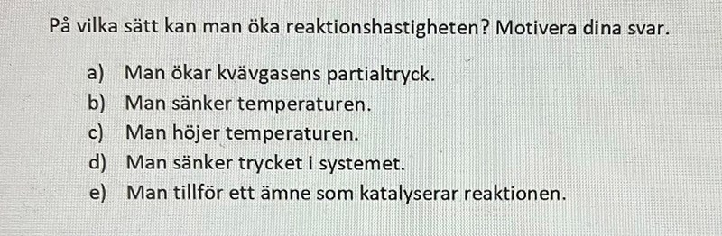 Jag håller på med denna uppgift som du kan se nedan. I a) har jag ingen aning om hur kvävgasens partialtryck påverkar reaktionshastigheten och skulle verkligen up om någon kunde förklara det för mig. I b) så kan man öka reaktionshastigheten genom att höja temperaturen för att desto högre temperatur desto snabbare går reaktionen (då kollisionsenergin ökar). I c) Vet jag inte hur man kan öka reaktionshastigheten för det står ju redan att man höjer temperaturen så jag vet inte riktigt vad dem menade i den frågan och skulle även här uppskatta hjälp! I d) så vet jag även här inte hur trycket påverkar reaktionshastigheten och skulle verkligen uppskatta om någon kunde förklara det för mig! Ökar elr minskar reaktionshastigheten desto högre tryck man har? Och varför är det så? I e) så vet jag att en katalysator redan påverkar reaktionshastigheten så att hastigheten ökar, därför vet jag inte riktigt vad dem menar i uppgiften då det redan står ”man tillför ett ämne som katalyserar reaktionen”. Jag uppskattar all hjälp på alla dessa frågor!
