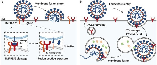Bägge varianterna beskrivs i bilden nedan, lite mer information kan du få om du söker med t.ex. "membranförsett virus cell fusion" eller liknande.