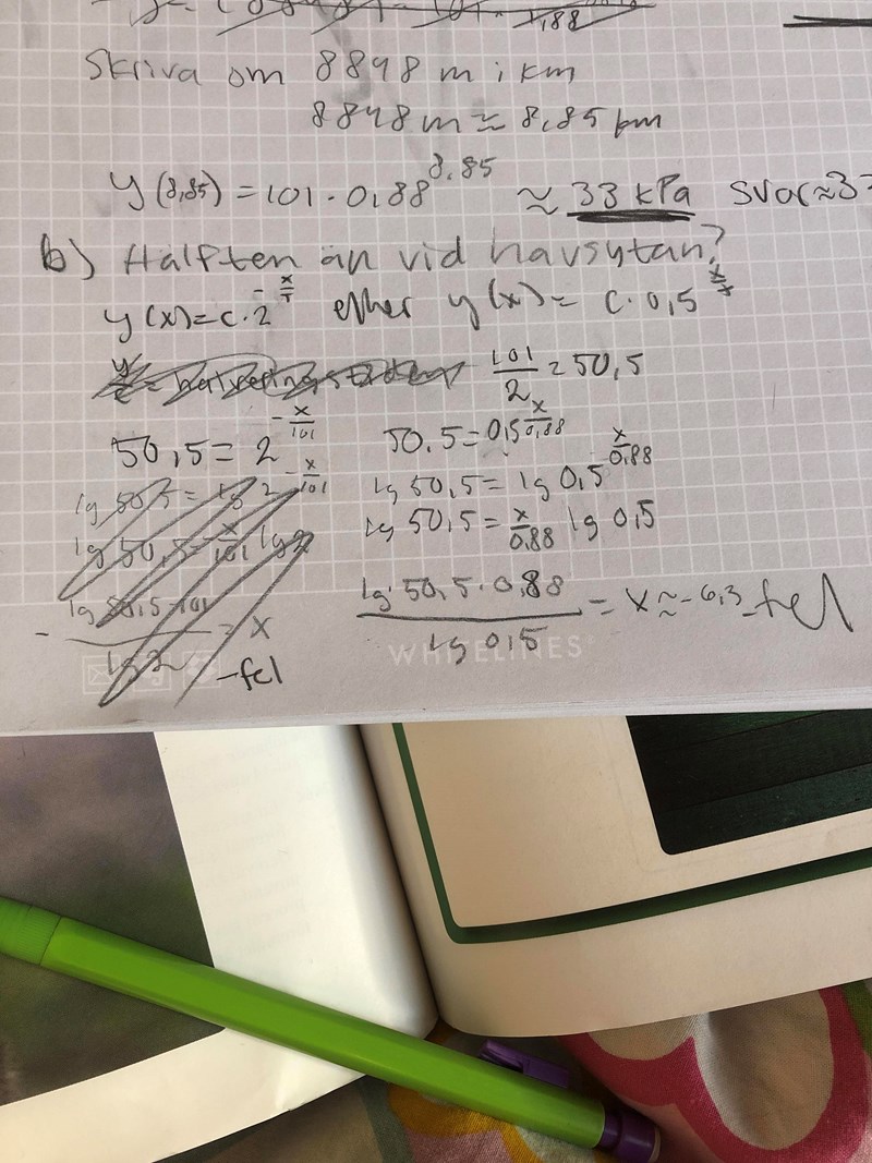 Ja, modellen är y = 101*0.88^x. Nu ska du bara sätta in halva lufttrycket som y och lösa ut x.